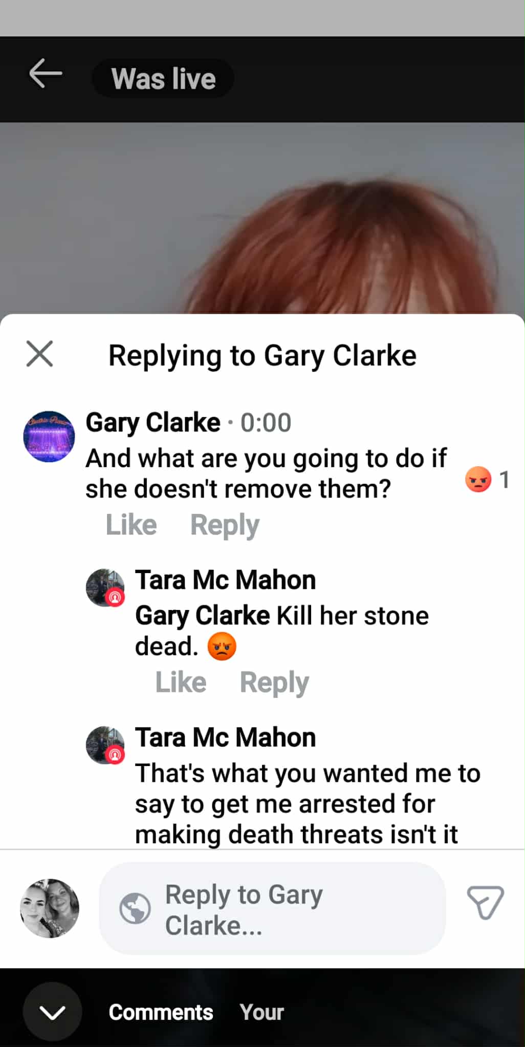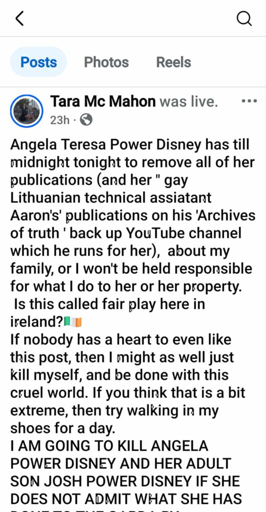 Amongst hundreds of screenshots of threats to kill, abuse and slander by Tara, I have a threat that as her ex husband worked as Head Chef in MOUNTJOY PRISON for 12 years IT WOULD BE VERY EASY TO ARRANGE TO GET ME KILLED!!